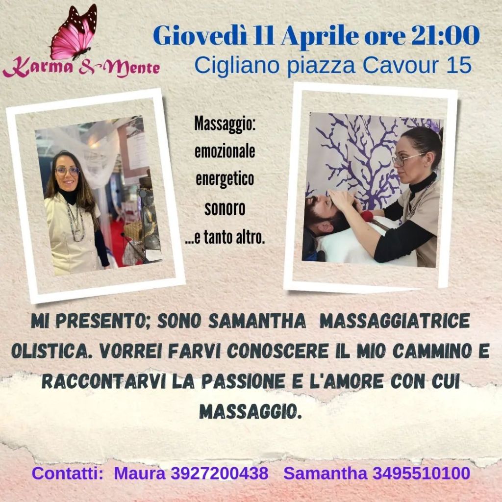 serata di conoscenza del massaggio energetico e sonoro. Pubblicato dakarmaemente3 aprile 2024Pubblicato in: EVENTITag:Samantha Pindo karmaemente La professionalità e l’amore che utilizza Samantha per portare benessere, attraverso il massaggio energetico e sonoro.venita a conoscerla. Evento gratuito . Per partecipare è necessaria la prenotazione Condividi: Fai clic per condividere su X (Si apre in una nuova finestra) X Fai clic per condividere su Facebook (Si apre in una nuova finestra) Facebook Mi piace Caricamento... Correlati Pubblicato da karmaemente La strada verso la consapevolezza attraverso la percezione Visualizza più articoli