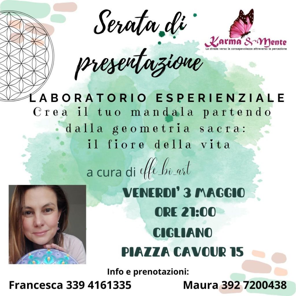 Serata di laboratorio sul fiore della vita Pubblicato dakarmaemente2 Maggio 2024Pubblicato in: EVENTI, NEWSTag:francescabaratono karmaemente Serata di presentazione del proprio fiore della vita con la geometria sacra Condividi: Fai clic per condividere su X (Si apre in una nuova finestra) X Fai clic per condividere su Facebook (Si apre in una nuova finestra) Facebook Mi piace Caricamento... Correlati Pubblicato da karmaemente La strada verso la consapevolezza attraverso la percezione Visualizza più articoli