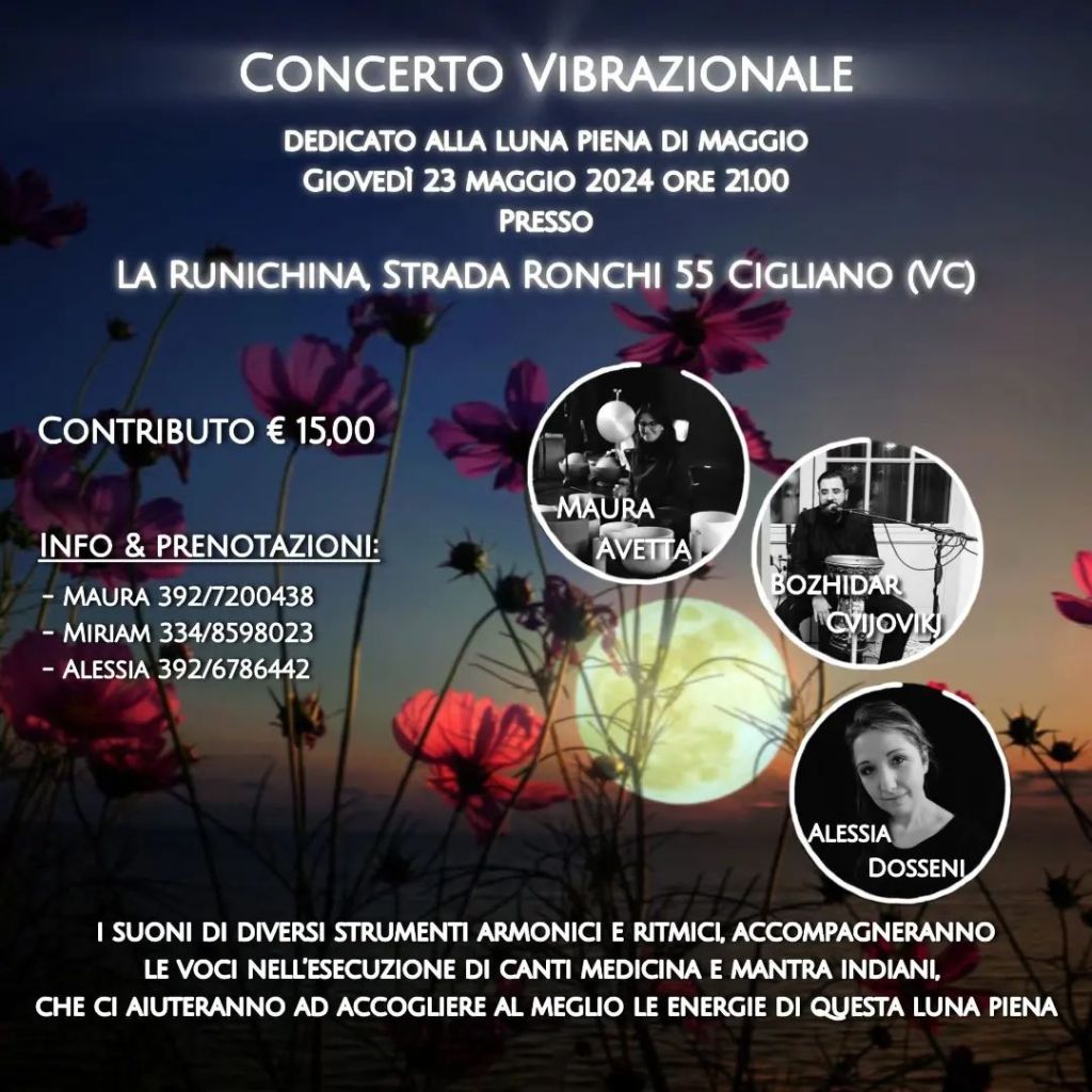 Concerto vibrazionale 23Maggio Pubblicato dakarmaemente14 Maggio 2024Pubblicato in: Senza categoriaTag:Alessia Dosseni karmaemente, Runchina, Samantha Pindo karmaemente Serata di luna piena accompagnata da buona musica meditativa in uno splendido posto. Il contributo per l’ evento e’ di 15 euro a persona ,per partecipare è necessaria la prenotazione al 3927200438. Condividi: Fai clic per condividere su X (Si apre in una nuova finestra) X Fai clic per condividere su Facebook (Si apre in una nuova finestra) Facebook Mi piace Caricamento... Correlati Pubblicato da karmaemente La strada verso la consapevolezza attraverso la percezione Visualizza più articoli