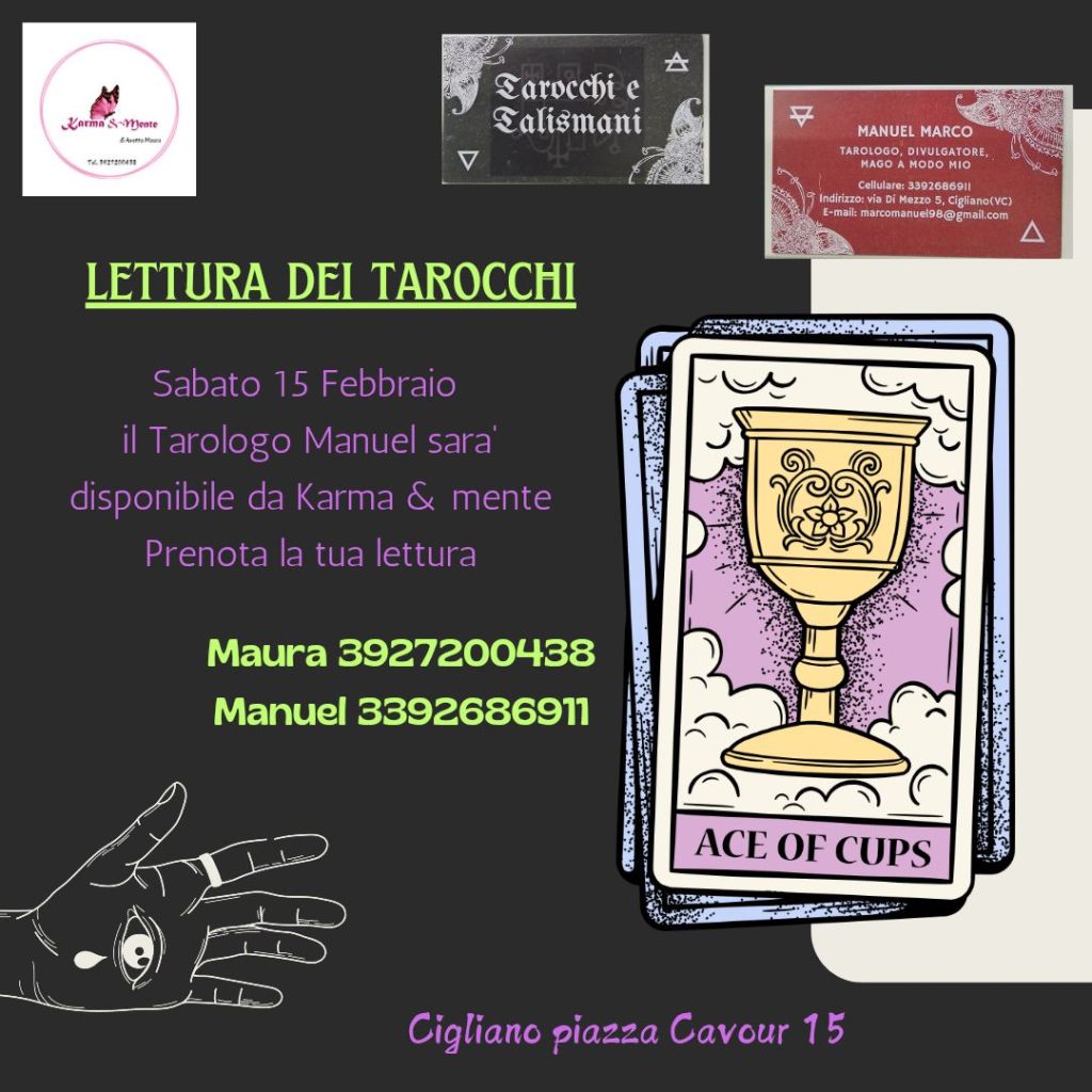 Lettura dei tarocchi Pubblicato dakarmaemente16 gennaio 2025Pubblicato in: EVENTI, NEWSTag:karmaemente, Manuel Marco Il sensitivo Manuel ti leggerà il futuro attraverso i suoi tarocchi. Non perdere questa occasione da karma & mente. Condividi: Fai clic per condividere su X (Si apre in una nuova finestra) X Fai clic per condividere su Facebook (Si apre in una nuova finestra) Facebook Mi piace Caricamento... Correlati Pubblicato da karmaemente La strada verso la consapevolezza attraverso la percezione Visualizza più articoli