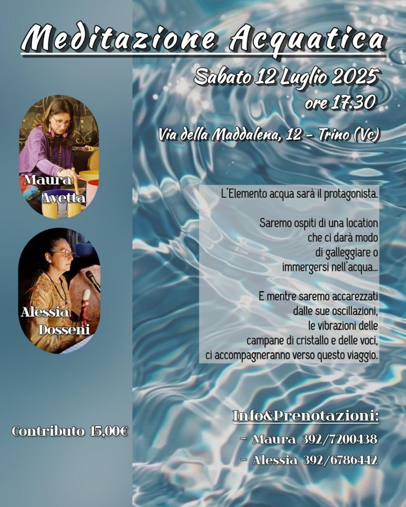 Meditazione in piscina Pubblicato dakarmaemente3 luglio 2025Pubblicato in: EVENTI, NEWSTag:Alessia Dosseni karmaemente Immergiti nell’ acqua o resta a galla , tutto sara’ sublimato da musica rilassante e una meditazione guidata. Alessia e Maura non vedono l ora di portarti nel loro viaggio di relax Condividi: Fai clic per condividere su X (Si apre in una nuova finestra) X Fai clic per condividere su Facebook (Si apre in una nuova finestra) Facebook Mi piace Caricamento... Correlati Pubblicato da karmaemente La strada verso la consapevolezza attraverso la percezione Visualizza più articoli