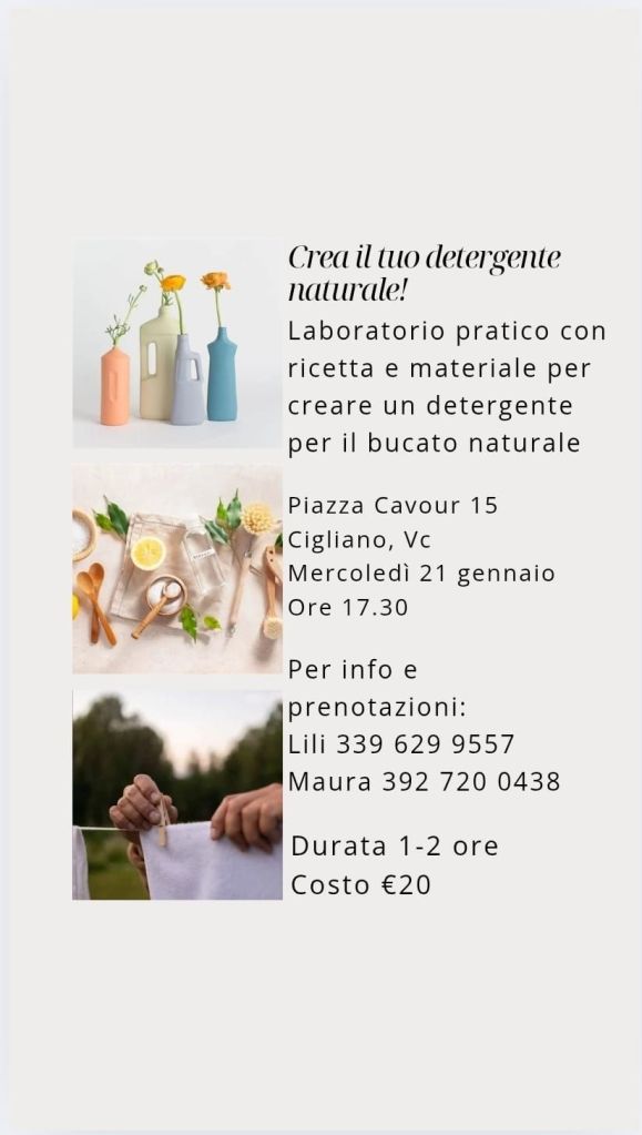 Crea il tuo detergente naturale Pubblicato dakarmaemente10 gennaio 202610 gennaio 2026Pubblicato in: EVENTI, NEWSTag:karmaemente, modiga liliana Laboratorio con Modiga Liliana , crea il tuo detergente naturale per il tuo bucato. Materiale incluso costo dell evento € 20. Prenota al 3927200438 Condividi: Condividi su X (Si apre in una nuova finestra) X Condividi su Facebook (Si apre in una nuova finestra) Facebook Mi piace Caricamento... Correlati Pubblicato da karmaemente La strada verso la consapevolezza attraverso la percezione Visualizza più articoli