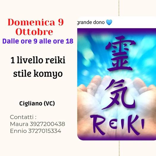 Domenica 9 ottobre dalle 9 alle 18, corso di primo livello Reiki stile komyo a Cigliano VC.
